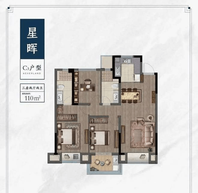 99㎡三房:三开间朝南,U型厨房+双卫设计,得房率85%