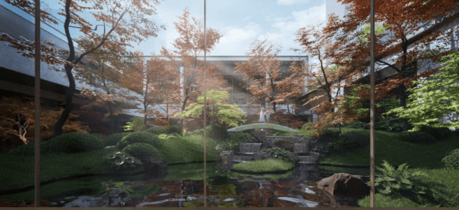 近1000㎡下沉庭院,取法名园造景精髓,精选乌桕、紫薇等古树名木,复刻苏式园林风貌