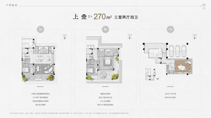270㎡ 上叠 1050 – 1150 38,500 – 42,600 3室2厅4卫,南向主卧观山,露台视野无遮挡