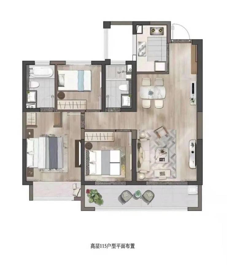 115㎡精装高层,三室两厅两卫。和一般的89㎡的户型有点像,感觉都是一进门就是厨房,餐厅客厅然后卫生间卧室。一般都是动静分离然后阳台是客厅和次卧共享。