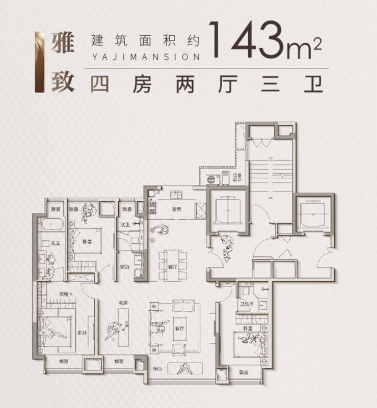 180㎡四房三卫:双套房设计,主卧约40㎡,双台盆卫浴,多重收纳系统,适合三代同堂或高端改善家庭