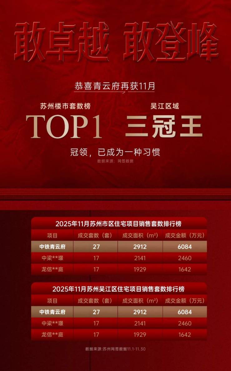 项目备案均价约24332元/㎡,精装交付标准≥3000元/㎡,包含日立中央空调、菲斯曼地暖、兰舍新风等高端配置。相比周边同类产品,青云府凭借央企品质背书和地铁优势,性价比突出,2025年10月曾以"销售套数、面积、金额"三冠王登顶吴江楼市。