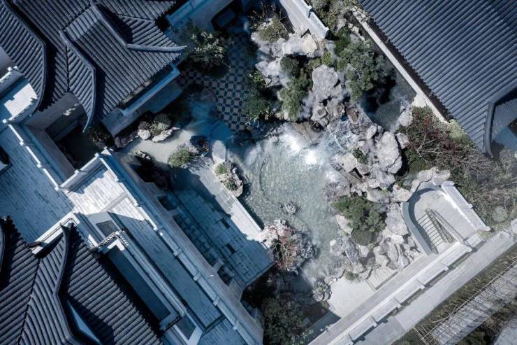 步入与山门之后,映入眼帘的是一座下沉式庭院,庭院下沉,原本平底阁楼,如今显得高耸入云。中有瀑布倾泻而下,其势有凌空之意,令观者顿生“江流天地外”的美感,叠石理水,亦有“山色有中无”的意境。