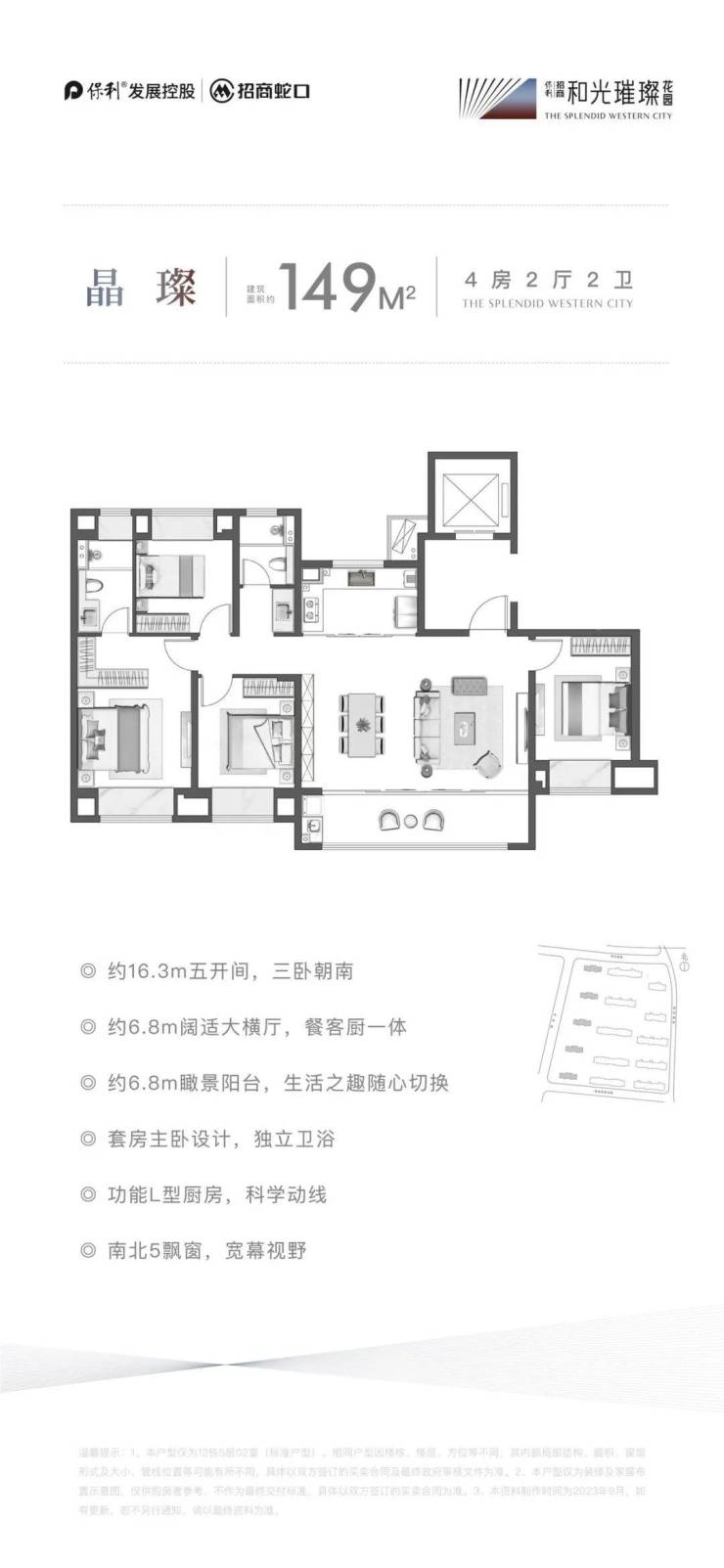 约149㎡四房:约6.8米阔景横厅,五开间朝南,L型厨房+6.8米瞰景阳台,主卧套房+独立卫浴