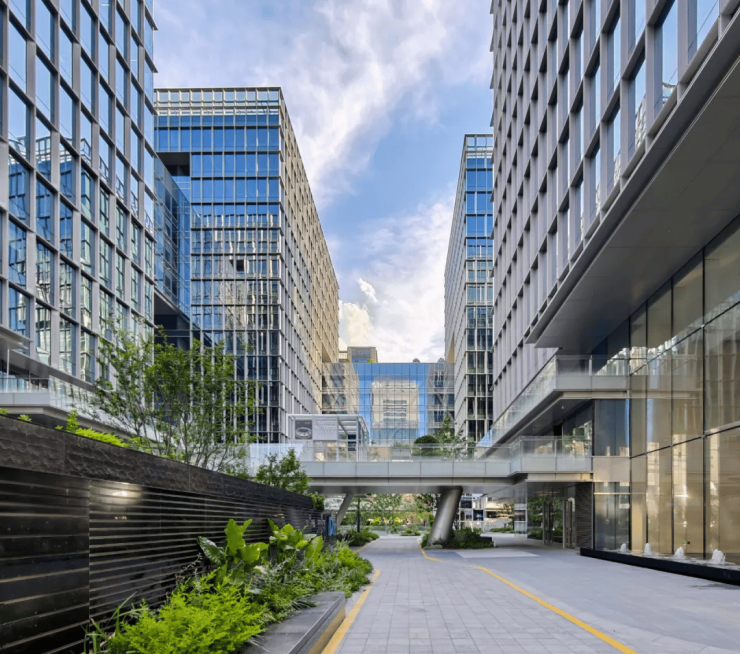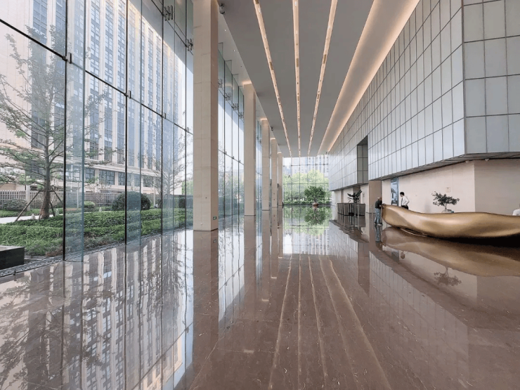 建筑与空间:项目由4栋超甲级办公楼围合组成,标准层高约4.2-4.3米,提供300平方米起灵活分割的办公空间,整层面积约2300-2500平方米,采用无柱设计。大堂为约13.5米挑高、约800平方米的星光艺术大堂,设计灵感源自南宋汝窑瓷韵。