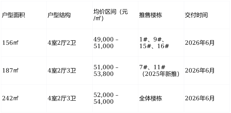 在售状态:持续推售中,主力户型为156㎡、187㎡、242㎡大平层,备案均价约49,000–53,800元/㎡,预计2026年6月精装交付。