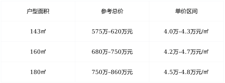 主力户型 :建面 143㎡、160㎡、180㎡ 四房,均为 南北通透、LDKB一体化设计 ,主卧配270°转角窗,部分户型设双台盆、独立衣帽间,得房率超 80%