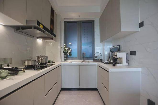 约5.8米横厅连接超大阔景阳台,如此阔绰尺度,在市面上极为罕见;U型厨房连接独立餐厅,生活井然有序。