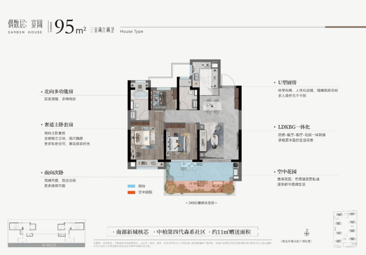 主力在售户型为建筑面积约95-111㎡的三房两厅两卫,能很好地适应市场主流家庭结构的需求。在户型设计上颇具巧思,采用奇偶层错位布局:奇数层设南向或270°转角庭院,偶数层实现南北双庭院,结合6米挑高与隐私挡板,打造出“层层有花园”的立体生态体验,让高层住户也能拥有独立的私人绿化空间,满足了喜爱园艺、追求自然生活方式家庭的需求。