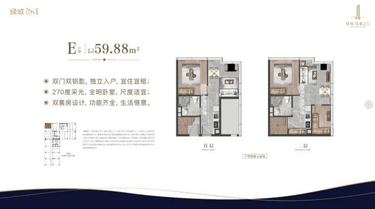 建筑面积约34-59㎡双钥匙公馆,买一层享两层,双倍空间,灵活多变,满足居住、办公、投资等多重需求,是杭州难寻的60万以下小户资产,且为实景准现房,小投入回报快,明星产品价值显著。