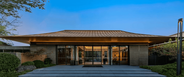 项目采用"围合式"布局,建筑外立面融合苏州传统民居元素与现代简约风格,以灰白为主色调搭配香槟金铝板线条,顶部设计飞檐飘檐,既保留江南韵味又具国际审美