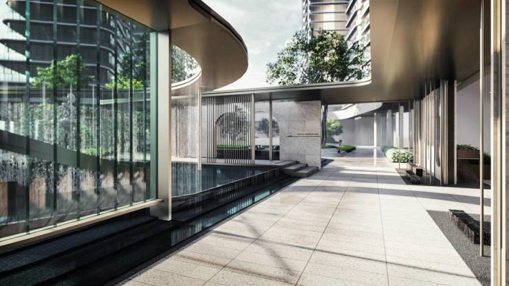 围合式园林:350米风雨连廊串联中央草坪与下沉庭院,外立面采用流线型玻璃幕墙+香槟金铝板