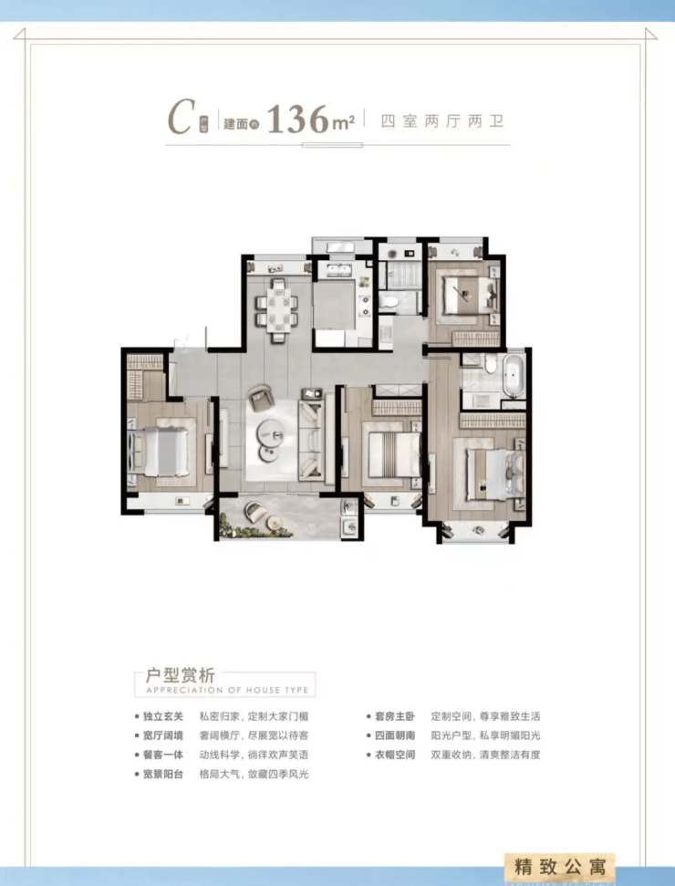 改善型家庭:136㎡四房或叠墅产品,满足多孩家庭对空间与品质的双重需求。