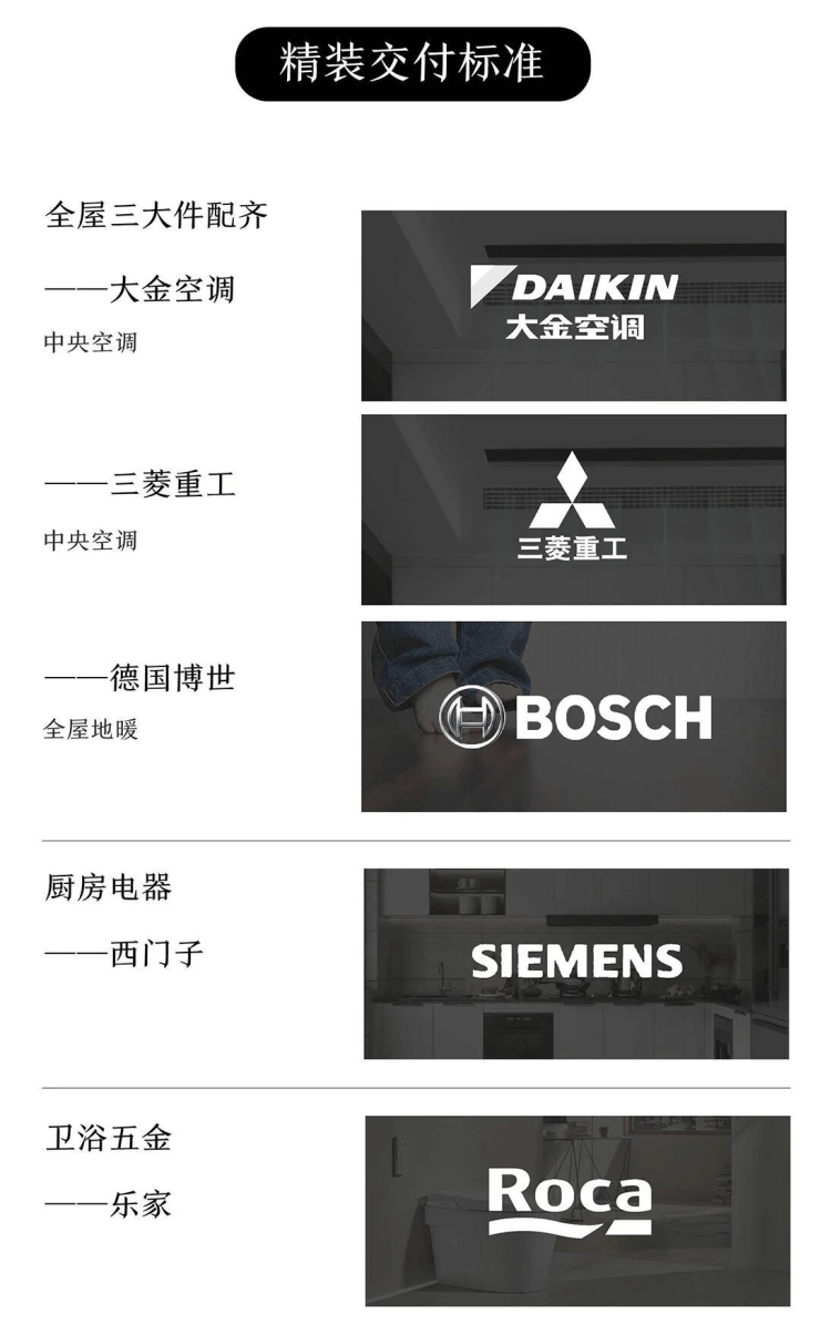 全屋精装标准约8,000–10,000元/㎡ : 方太/老板厨电、科勒九牧卫浴、全屋地暖、中央空调、ABB智能安防系统