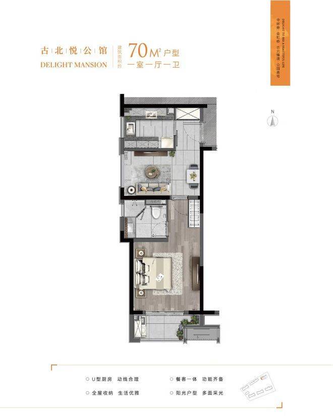 51–60㎡一居室:“空间魔术师”户型,客厅+餐厅+工作区一体化,独立玄关+干湿分离卫浴,得房率超78%;