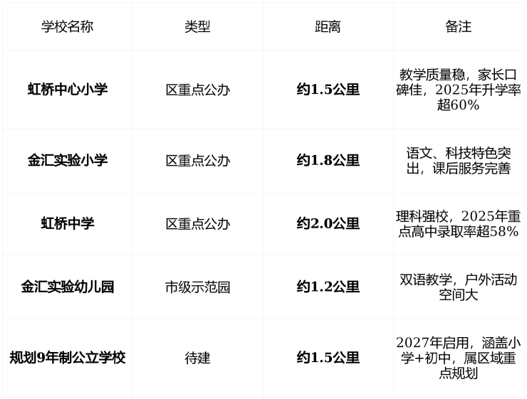 关键提示 : 项目无新建对口校 , 学区划片以教育局当年公布为准 ,但 虹桥中心小学+金汇实验小学 为 步行可达 的 真实优质资源 , 非“画饼” 。