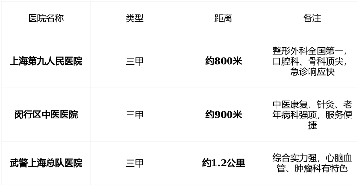 说明 : 三甲医院1公里内全覆盖 , 远超同板块多数项目 , 医疗资源密度为闵行核心区之最 。