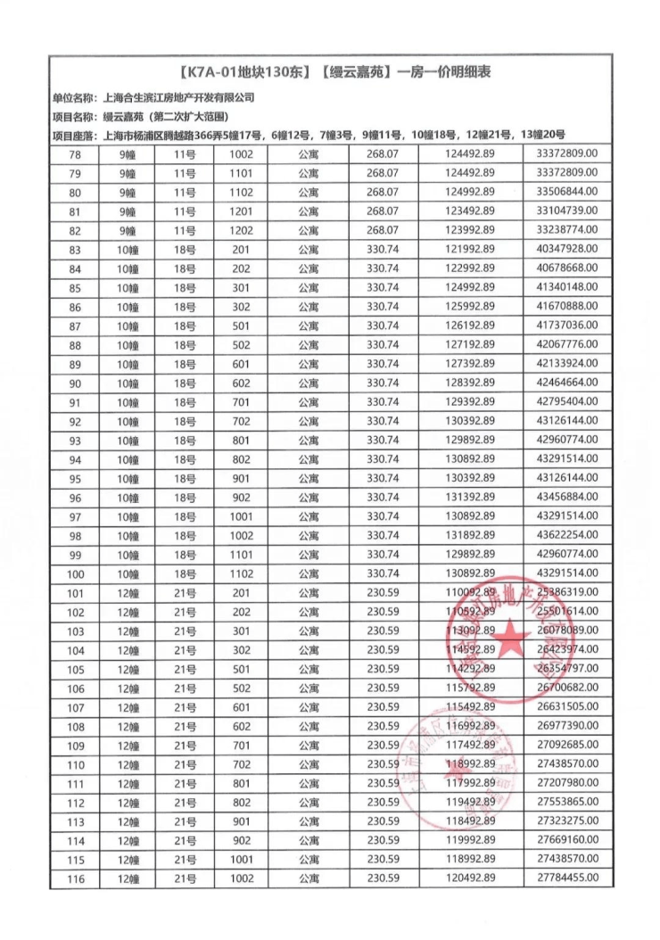 一房一价表如下