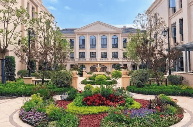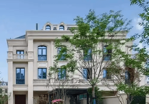 项目由25幢四联排、27幢双联排组成,采用全石材干挂立面+香槟金铝板,复刻凡尔赛宫雕花廊柱、斜坡屋顶等经典元素,建筑成本较常规提升50%。