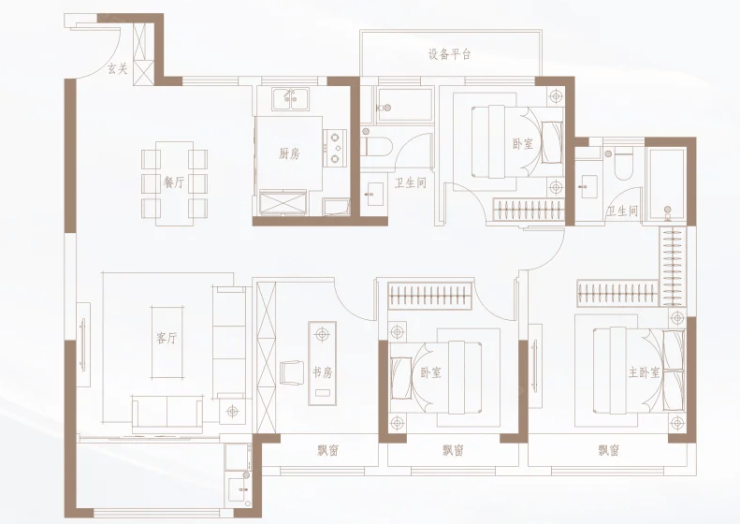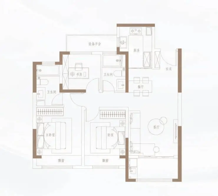 103㎡三室两厅两卫:南向面宽10.4米,全明格局