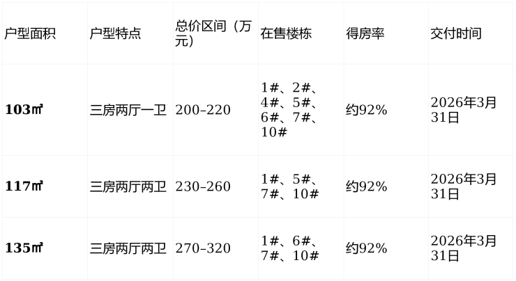 ✅ 温馨提示 :目前 103–117㎡主力户型仍有余量 ,适合年轻家庭;135㎡为改善首选,建议尽快锁定。