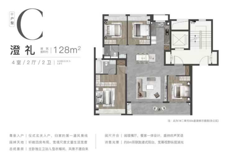 128㎡:四房两卫,主卧套房+独立衣帽间,改善首选 。