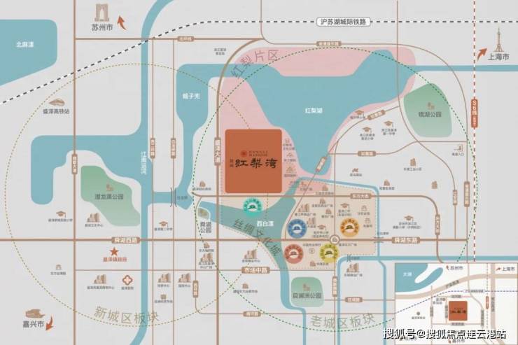 片区位置:盛泽大道与东方大街交汇地带,北依红梨湖(今桥北荡),南临西白漾,盛泽“一心两轴多片区”城市规划重要组成。
