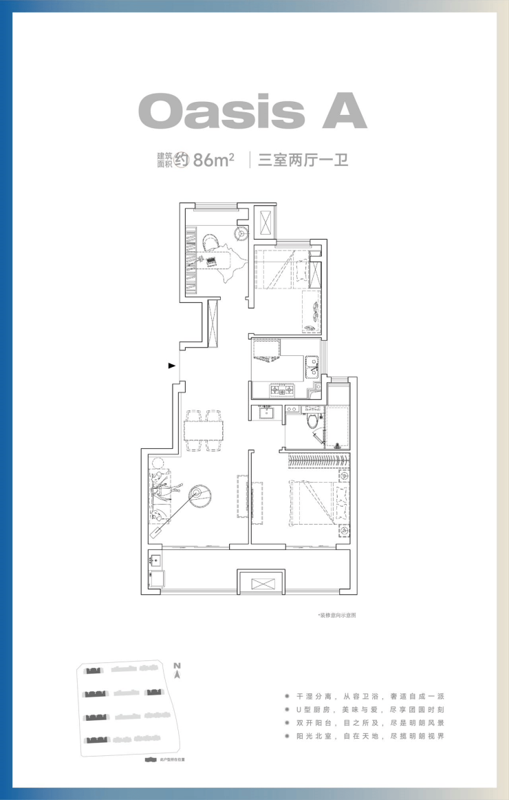 户型跨度86-170㎡,独创双产品线:一期毛坯(2025年7月交付)满足个性化需求,二期精装搭载朗诗第六代AI健康系统(2026年9月交付)