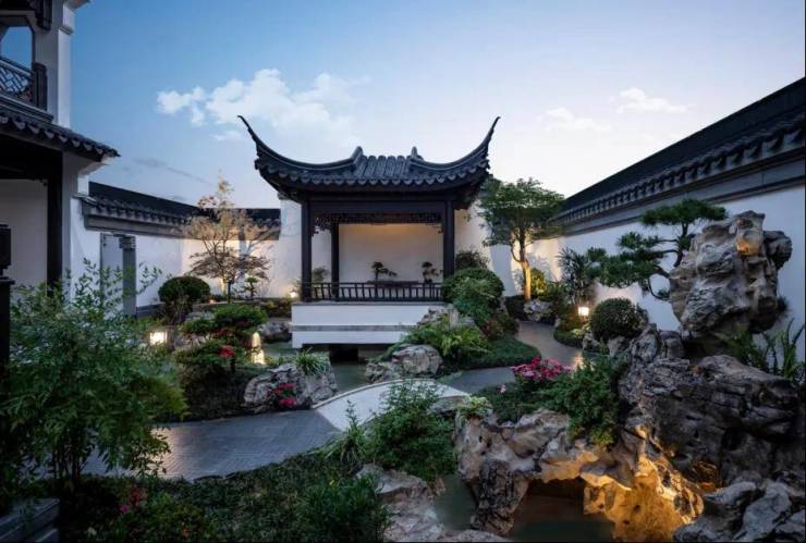 项目景观由苏州园林发展股份有限公司设计,苏州园林发展股份有限公司在全球中式设计院连续五年TOP1,也是苏州园林指定维护单位,所筑皆为景观标杆之作。