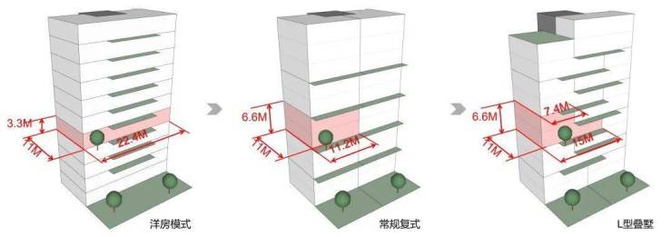在遵循严格基地限定层数11层与容积率1.9的条件下,我们精心构思了一种独特的建筑形态。建筑的基础单元呈现出11.2米的宽广度、11米的深度以及6.6米的高度,这为设计提供了层洋房或复式户型的常规选择。然而,受限于空间尺度,传统意义上拥有“院墅感”的宽敞空间似乎难以实现。