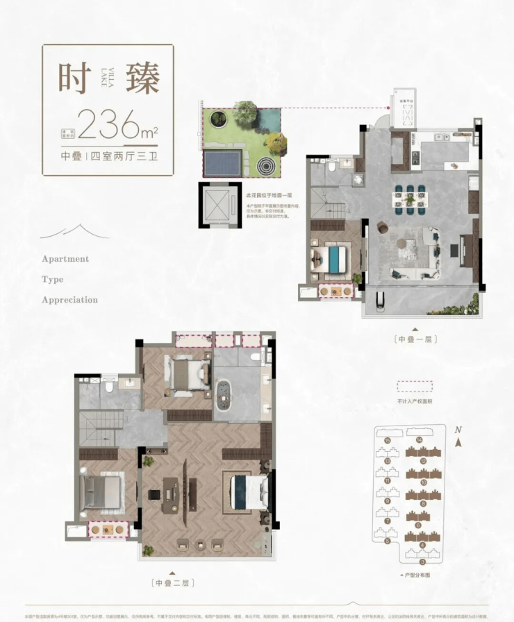 · 中/下叠:236㎡ 四房两厅三卫,下叠赠送约35㎡南向花园,中叠赠送约15㎡北向花园。