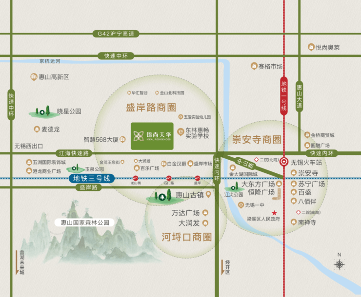 锦尚天华鼎立中山路西,出则繁华,入则静谧,拥享梁溪主城全维丰盛配套,江海西路、惠山隧道、快速内环、中环线(在建中)构筑快速交通路网,畅享一刻中心的高效便捷;中山路、盛岸路、河埒口等核芯商圈环伺,惠山国家森林公园、惠山古镇等丰富文旅资源,繁华都会与自然生态达成平衡,城市新贵的居住梦想在此得以实现,热销自然水到渠成。