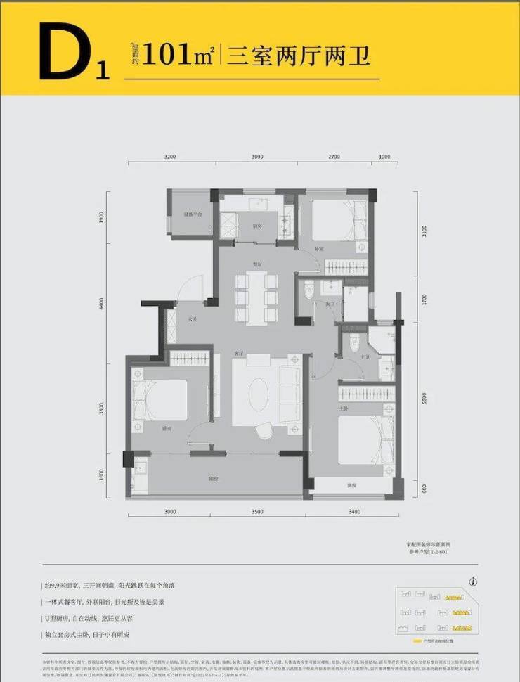 建筑面积约101㎡三室两厅两卫:约9.9m面宽,一体式餐客厅,外联阳台,大大拓宽了使用面积与客厅的空间感;U型厨房设计,自在动线,让烹饪更从容,厨房紧邻餐厅方便使用;独立套房式主卧,自在主人的私密时光。
