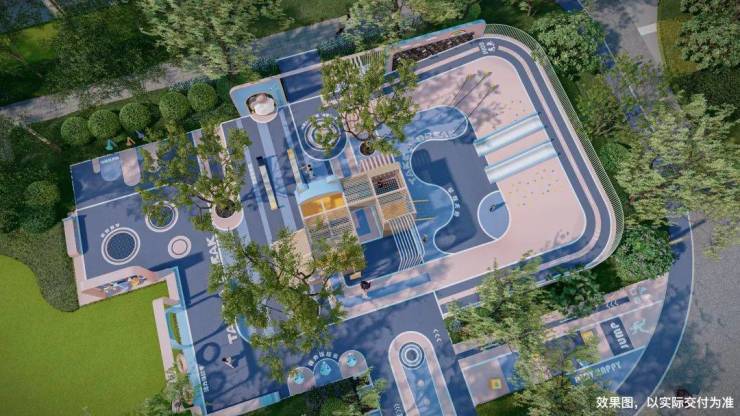 乐活康体环:环形慢跑道串联八大主题花园,蓝灰双色路面兼具美观与健身功能;