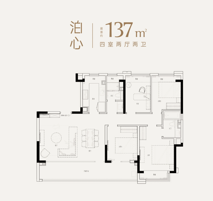 137㎡四居:IMAX级横厅搭配双联跑道阳台,进深2.1米可改书房,适配三代同堂居住^。