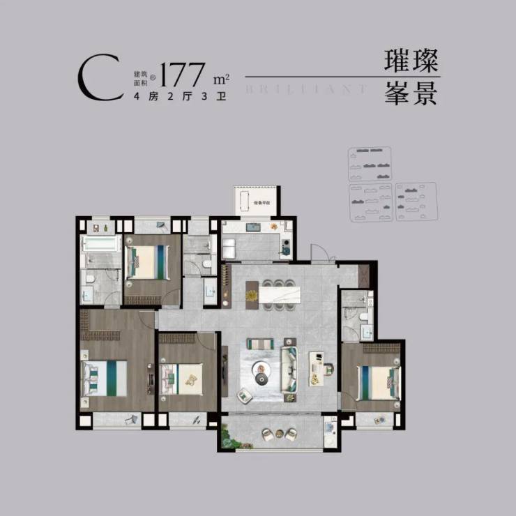璀璨璟园总建筑面积约为35.6万㎡,总规划户数达1388户,总楼栋29栋。项目采用1.85的容积率,绿地率高达30%,规划有24幢小高层和5幢洋房,为业主提供多种户型选择,约130㎡、143㎡、177㎡和200㎡。