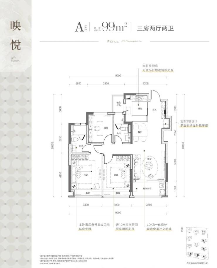 户型面积特点适合人群映悦A/A1/A2约99㎡高得房率(90%),中间套设计小家庭/首次置业者