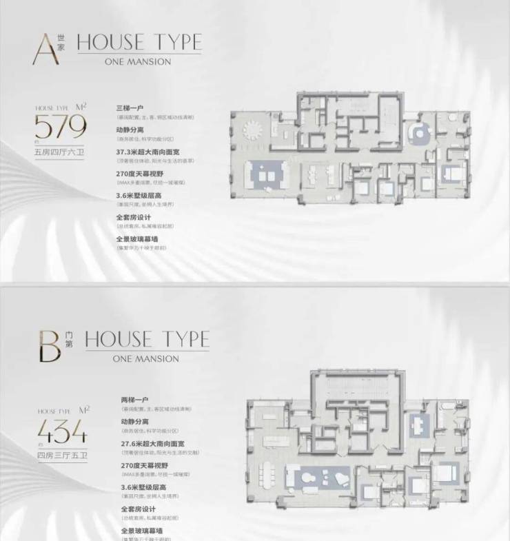 579㎡五房四厅三梯一户,南向面宽达37.3米客厅进深近17米配备三套房设计可设父母房、儿童房、书房/客房270°城市天幕景观