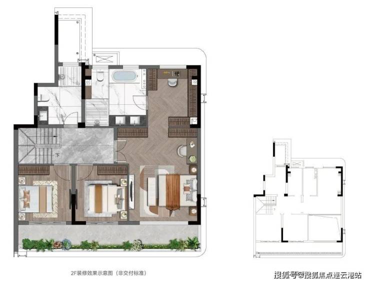 三楼也是双套房,朝北带露台,并且顶楼还送一个大露台(无需二次改造)。
