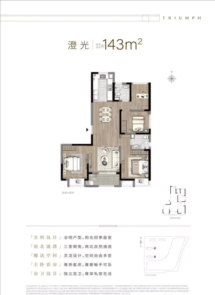 户型亮点:三居至四居设计,客餐厅相连,窗墙比高,部分房源带露台或花园