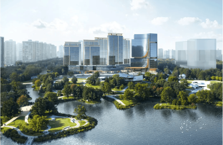 建筑风格:以“新宋风”为设计理念,打造约6000㎡实景园林,融入竹林曲径、叠石理水等宋代美学元素。建筑立面采用石材+铝板+金属格栅+大面玻璃,白、金色系搭配,弧形超大尺度玻璃窗。