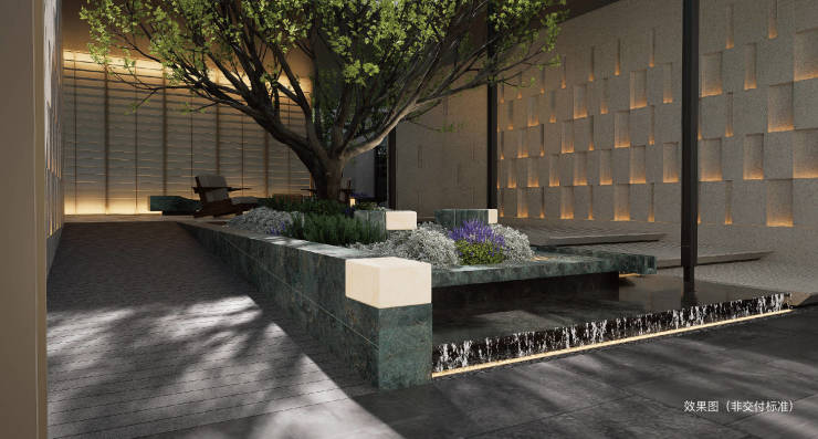 建筑立面采用现代Art Deco风格,米白石材+香槟色金属铝板,玻璃栏板模糊室内外边界,实现“建筑即风景”