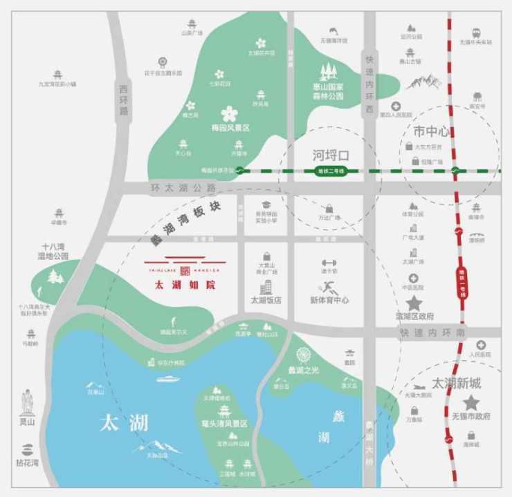 自驾:可通过环太湖公路快速通达市区,向东可快速接入万达商圈