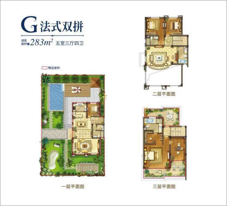 双拼别墅:面积283㎡,总价690万起,花园120-500㎡,7.5米客厅开间+6.3米挑空设计,可合并两套为独栋。