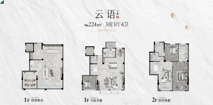 下叠:224-363㎡(3房3厅4卫),赠送15-30㎡花园+50-140㎡挑高地下室,总价600-650万元