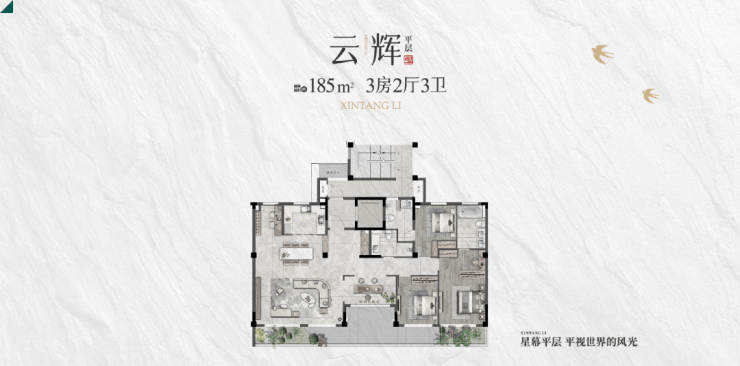 平层:185㎡(3房2厅3卫),赠送30㎡南向露台,总价420-460万元