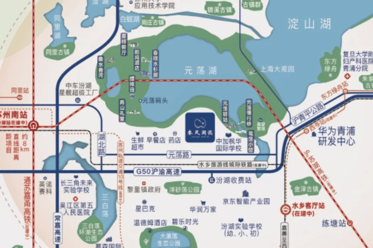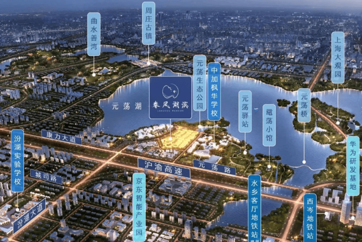 板块价值:毗邻元荡湖生态公园,23公里原生湖岸线,蓝绿空间占比69%,形成"一湖三园八景"生态格局
