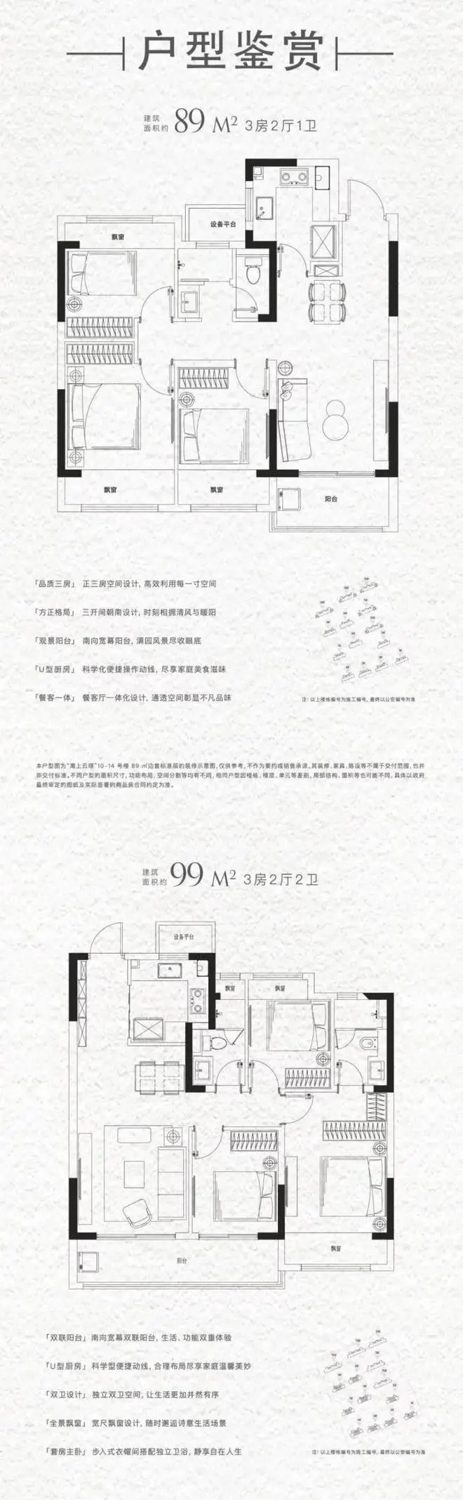 99㎡三室两厅两卫:双阳台配置,独立双卫,得房率约80%+,兼顾舒适性与功能性;