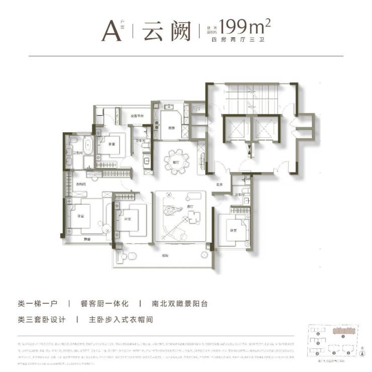 高层大平层:建面199㎡,四房三卫三阳台,南北通透,类一梯一户