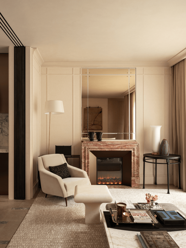 窗边的单人椅与床尾的凳榻,等待着一次阅读、一段眺望或一场无目的的小憩。